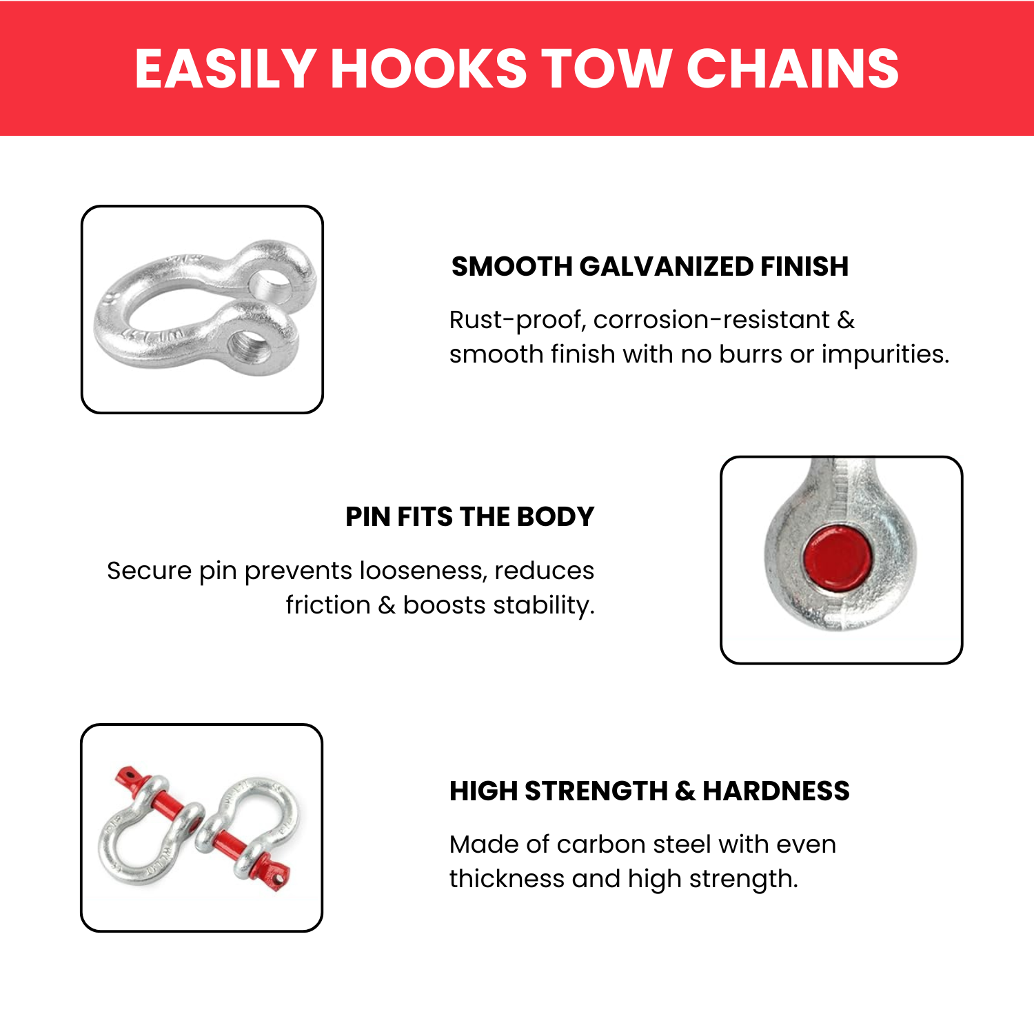 • Universal Fit :-This Bow shackles fits all kinds of towing straps to work on most off-road vehicles such as Jeeps, 4WD, SUV, Trucks, UTV, Sport-Utility Vehicles etc.